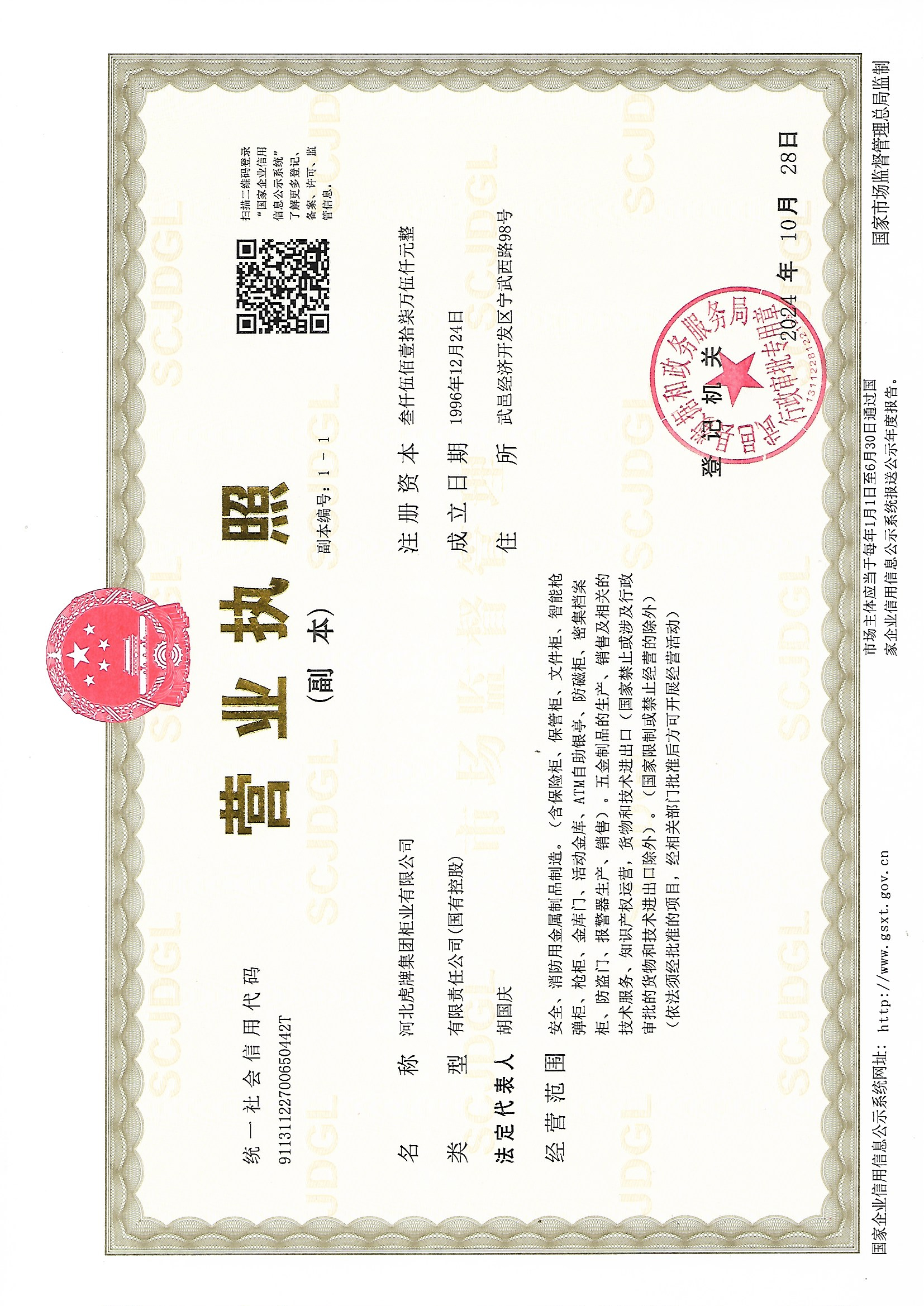 河北虎牌集團柜業有限公司是省級企業集團,1996年報經河北省政府批準組建,前身武邑縣保險柜廠始建于1979年。現有成員企業10家,控股企業6家,屬國有控股有限責任公司。總資產2億多元,擁有國內先進的數控沖裁、拉伸、折彎、焊接設備和噴塑、成裝生產線。產品設計全部由計算機立體設計完成,主要生產保險柜、檔案裝具、智能槍彈柜、銀行設備等九大系列100多個規格型號,年生產能力60萬臺套。技術力量雄厚,曾先后主持起草了河北省保險柜產品的地方標準和輕工部行業標準。虎牌品牌家喻戶曉,名揚國內外,虎牌商標1981年注冊,是具有悠久歷史的可持續發展的品牌。… 更多》